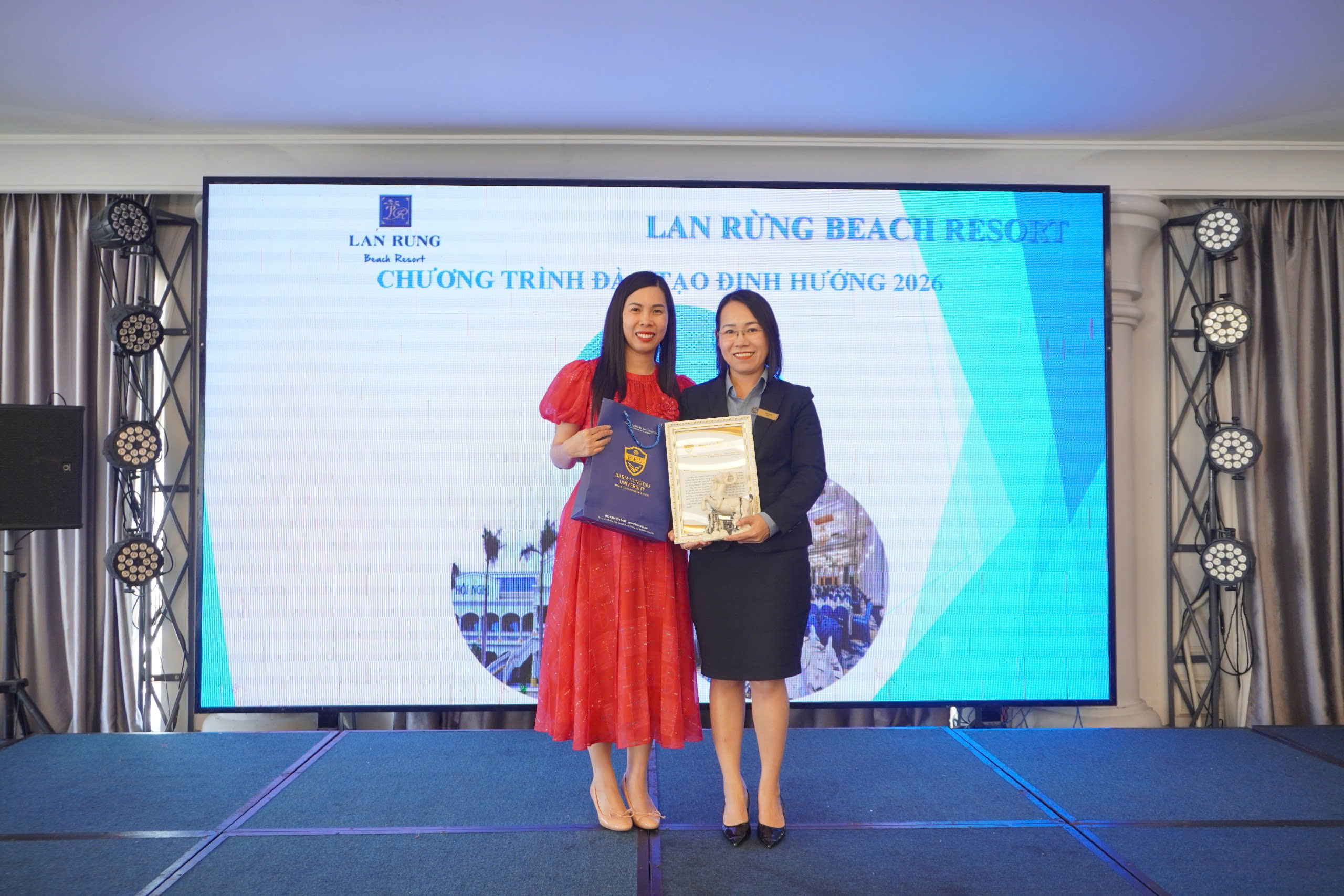 ThS. Phạm Thu Huyền – Giám đốc chương trình ngành Quản trị khách sạn – Khoa Du lịch – Sức và chị Thiềm Thanh Trang – Trưởng phòng Nhân sự của Lan Rừng Resort & Spa Phước Hải.