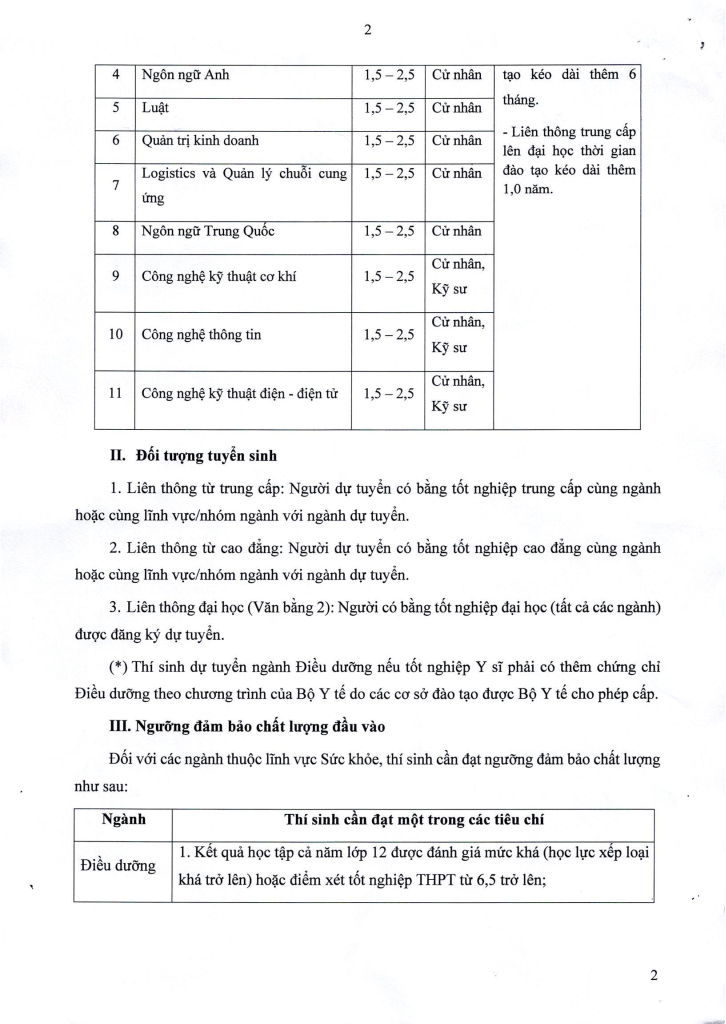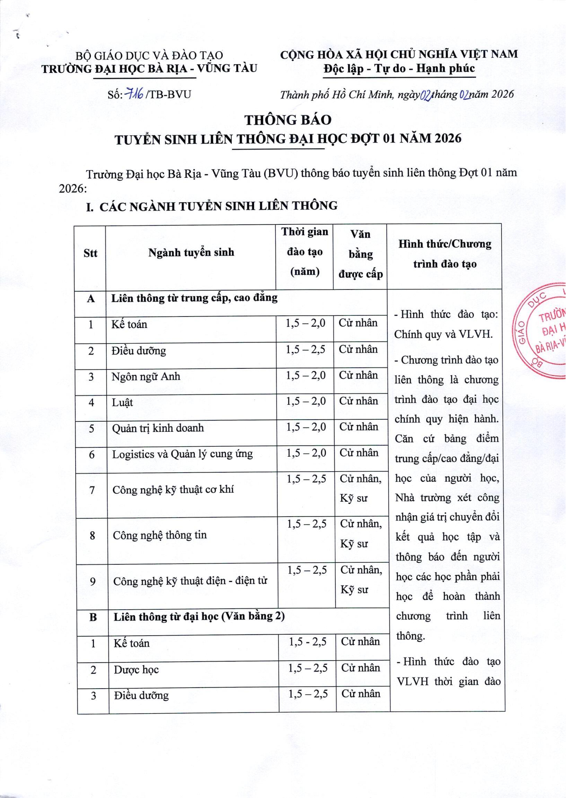 THÔNG BÁO TUYỂN SINH LIÊN THÔNG ĐẠI HỌC ĐỢT 01 NĂM 2026